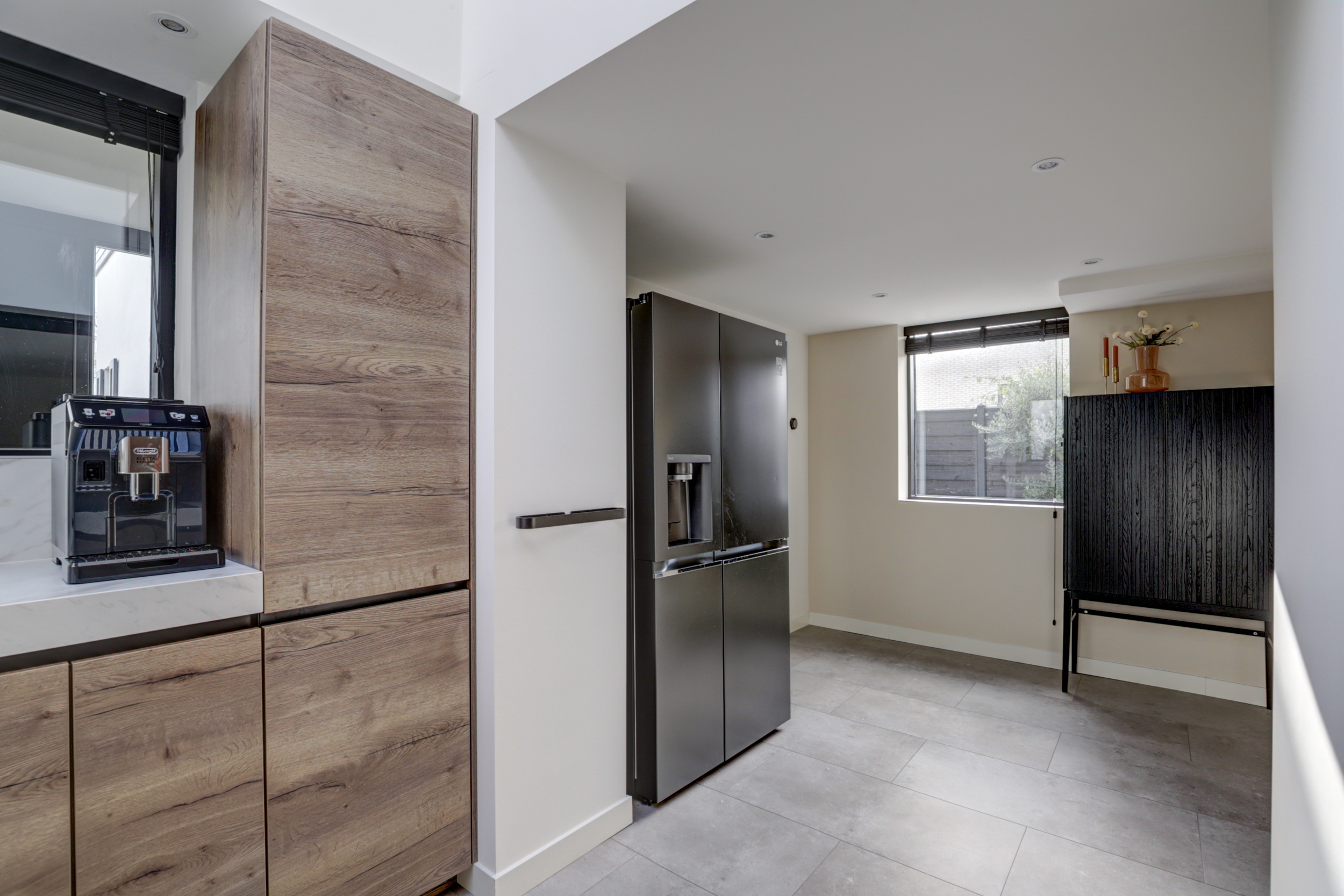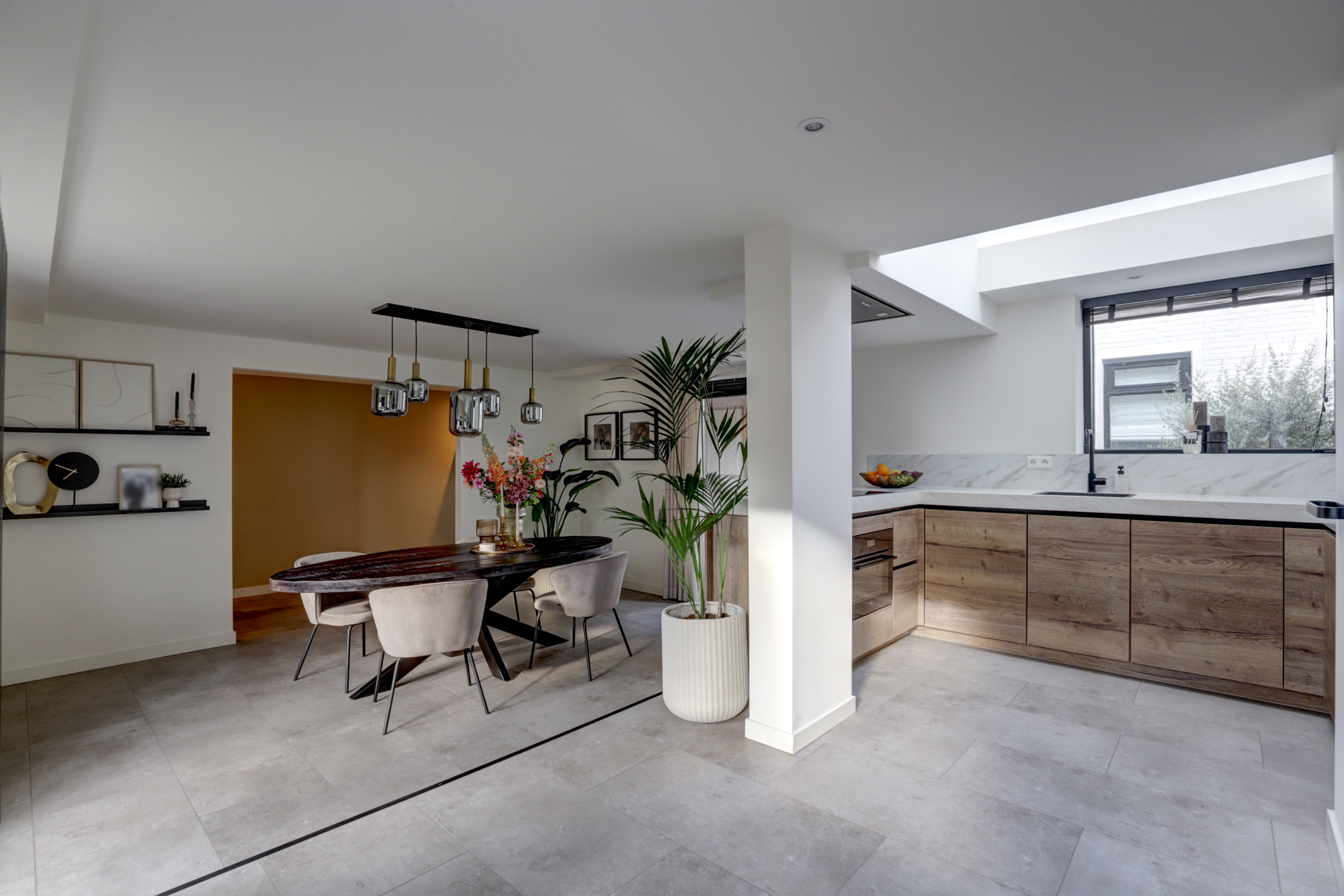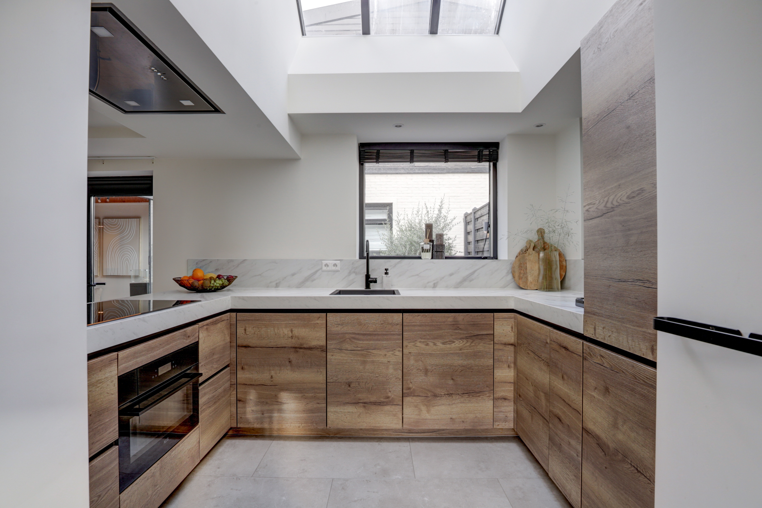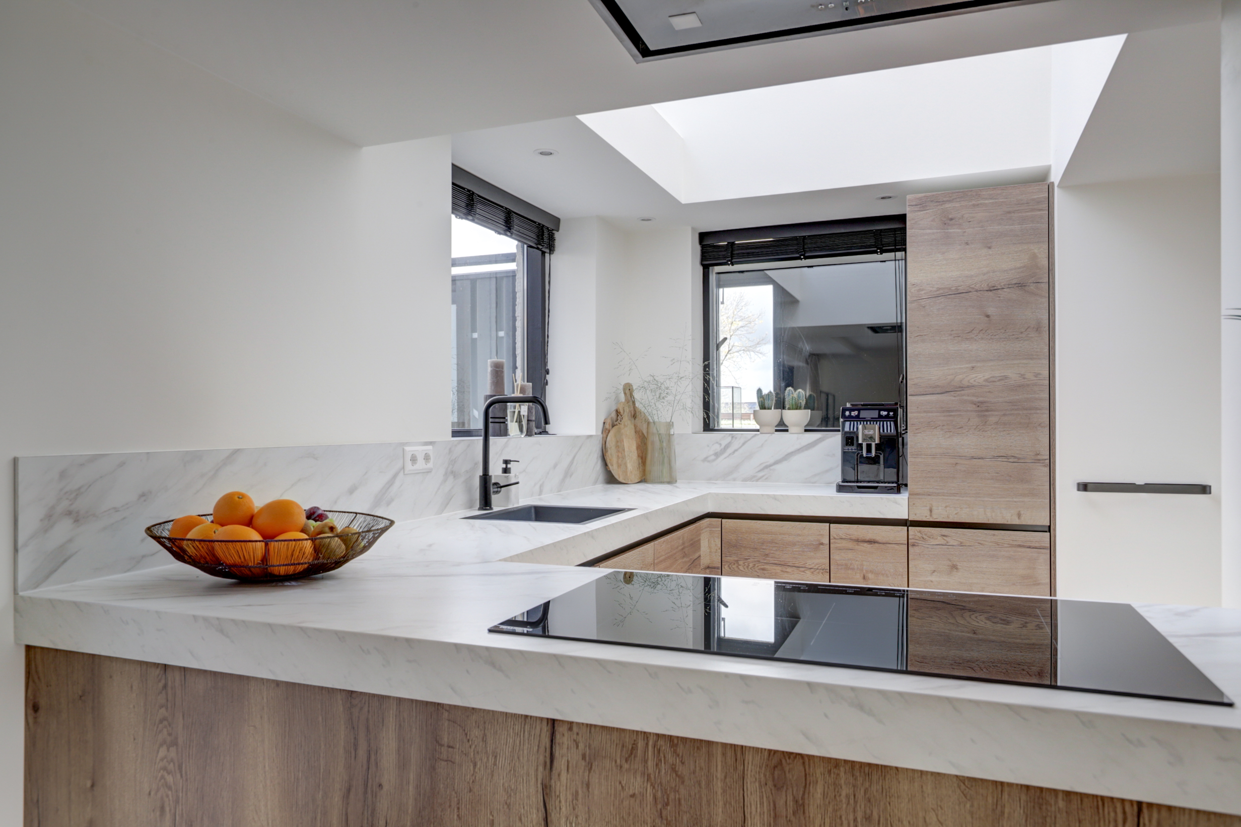 De keuken aan de andere achterzijde van de woning, is een echte blikvanger! Modern vormgegeven in een U-opstelling met houtstructuur fronten en een wit marmeren werkblad. Dankzij het grote daklicht valt het daglicht hier prachtig binnen. De keuken is voorzien van een inductiekookplaat, inbouwapparatuur op ooghoogte en veel kastruimte. Aan de keuken grenst een gezellig eetgedeelte waar u comfortabel kunt tafelen met uitzicht op de tuin. Hier kookt u niet alleen met gemak, maar geniet u ook van de stijlvolle afwerking. Vanuit de keuken bereikt u via beide kanten direct het terras in de achtertuin!