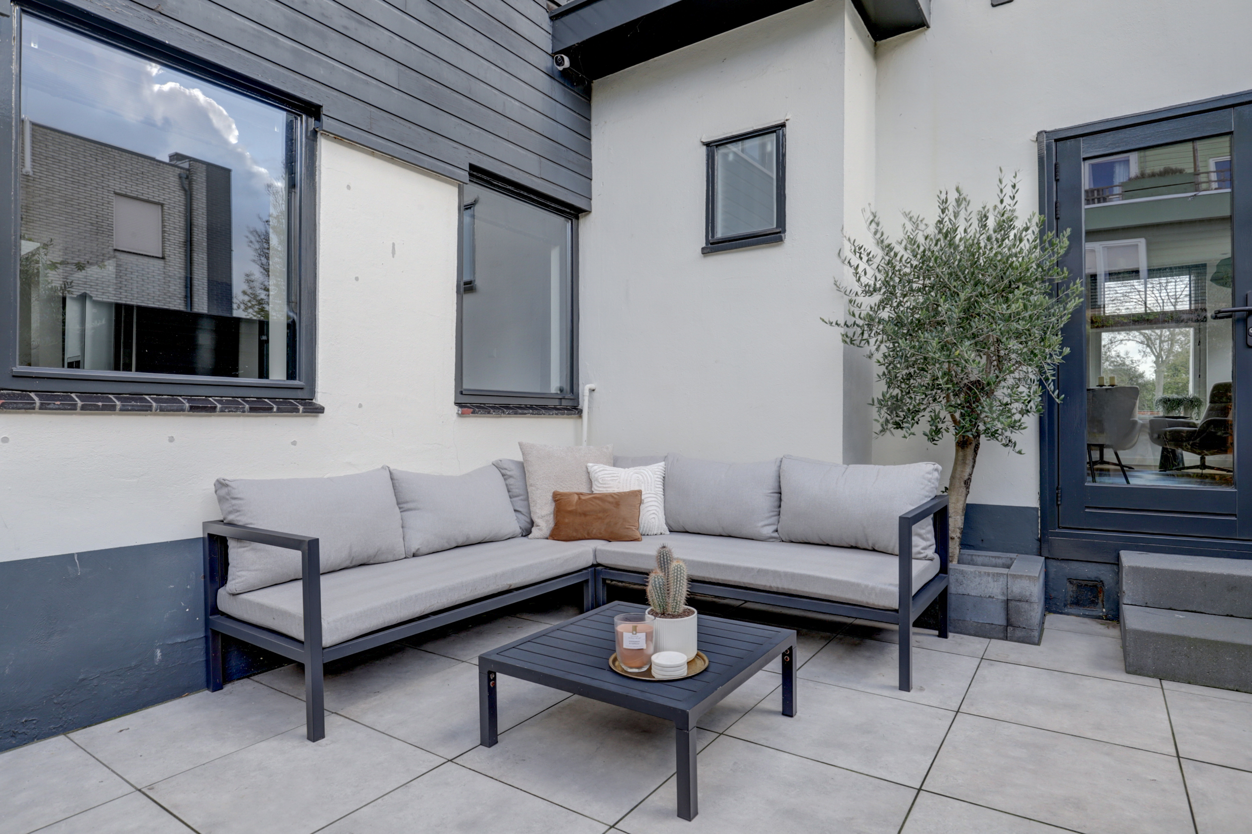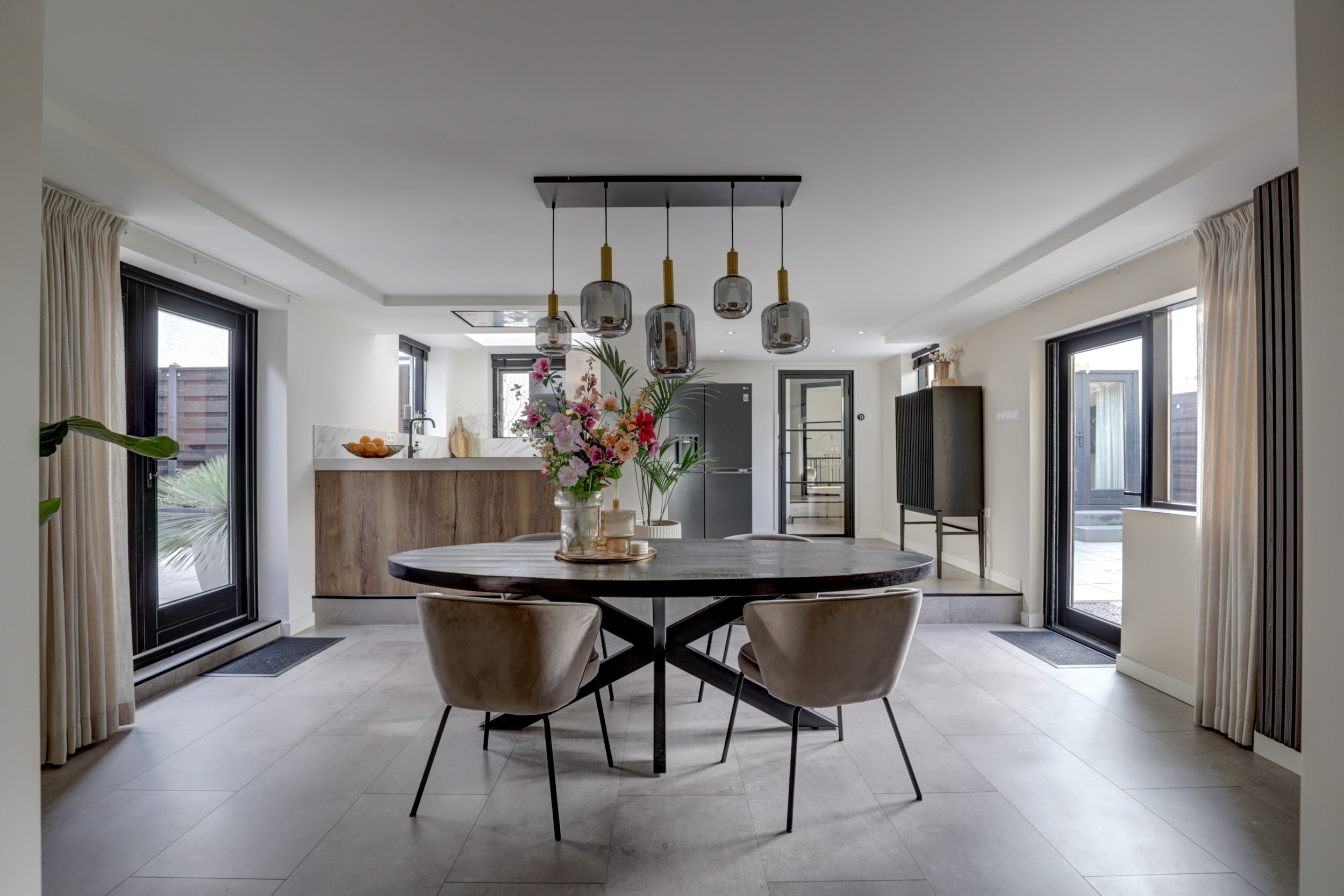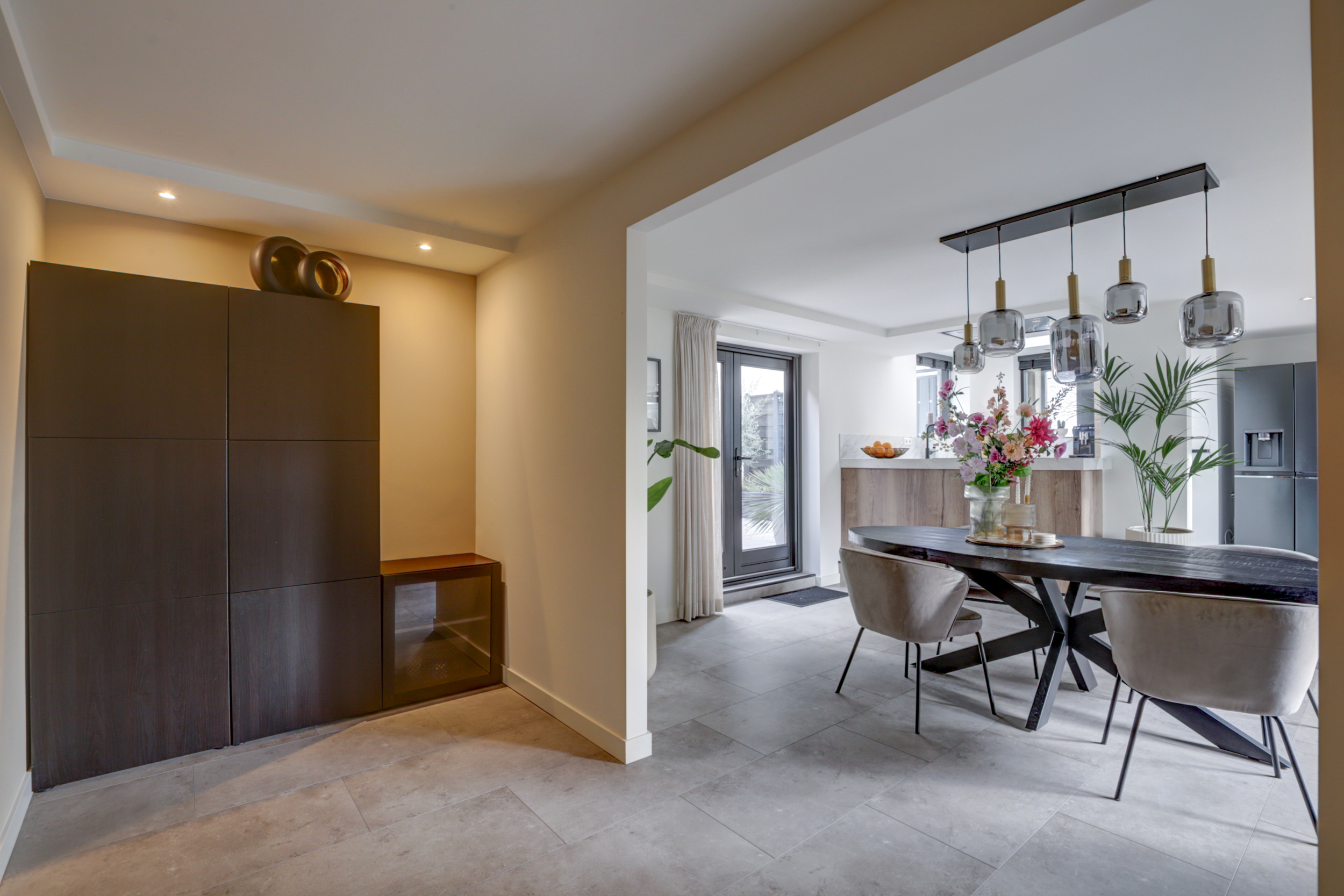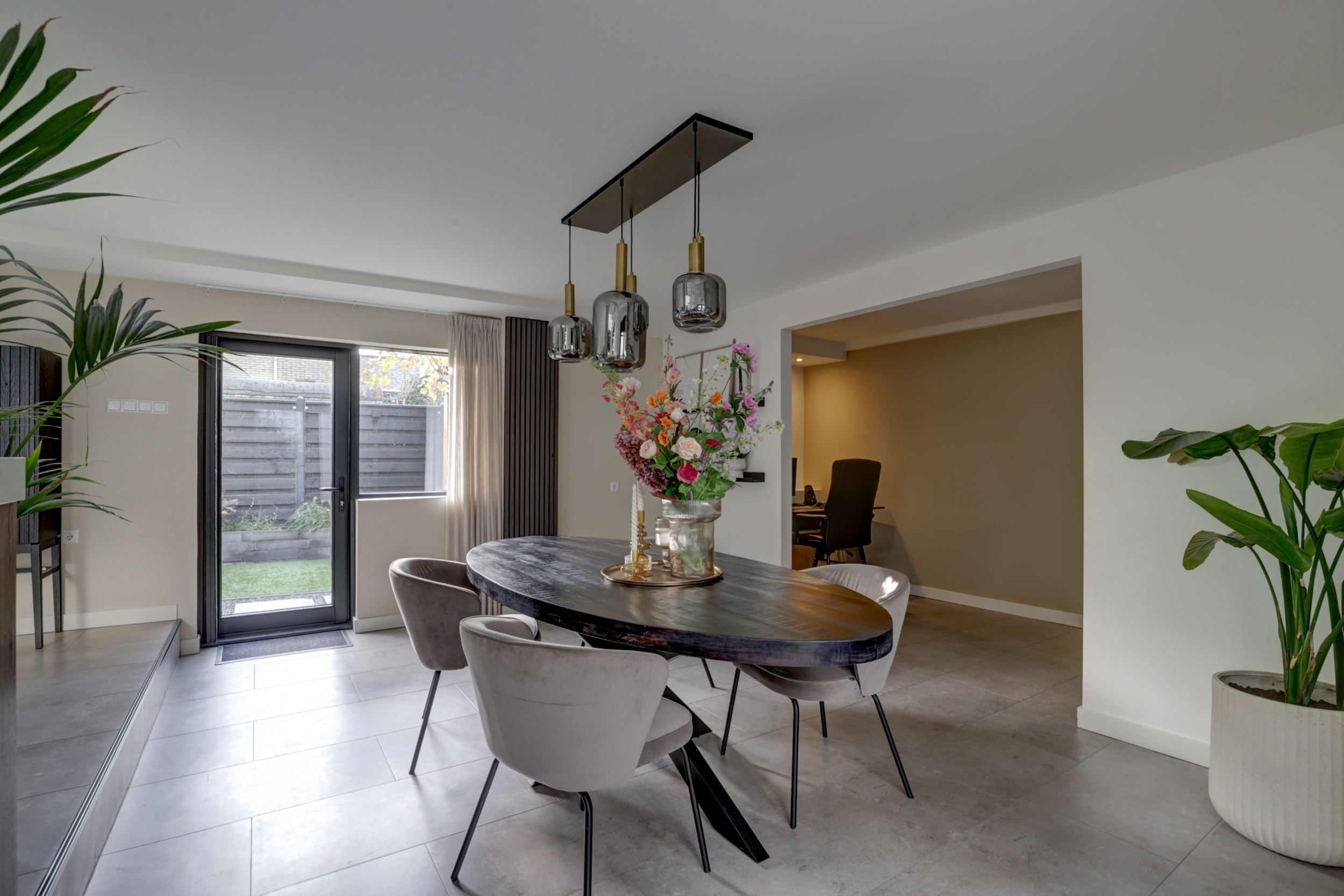 De keuken aan de andere achterzijde van de woning, is een echte blikvanger! Modern vormgegeven in een U-opstelling met houtstructuur fronten en een wit marmeren werkblad. Dankzij het grote daklicht valt het daglicht hier prachtig binnen. De keuken is voorzien van een inductiekookplaat, inbouwapparatuur op ooghoogte en veel kastruimte. Aan de keuken grenst een gezellig eetgedeelte waar u comfortabel kunt tafelen met uitzicht op de tuin. Hier kookt u niet alleen met gemak, maar geniet u ook van de stijlvolle afwerking. Vanuit de keuken bereikt u via beide kanten direct het terras in de achtertuin!