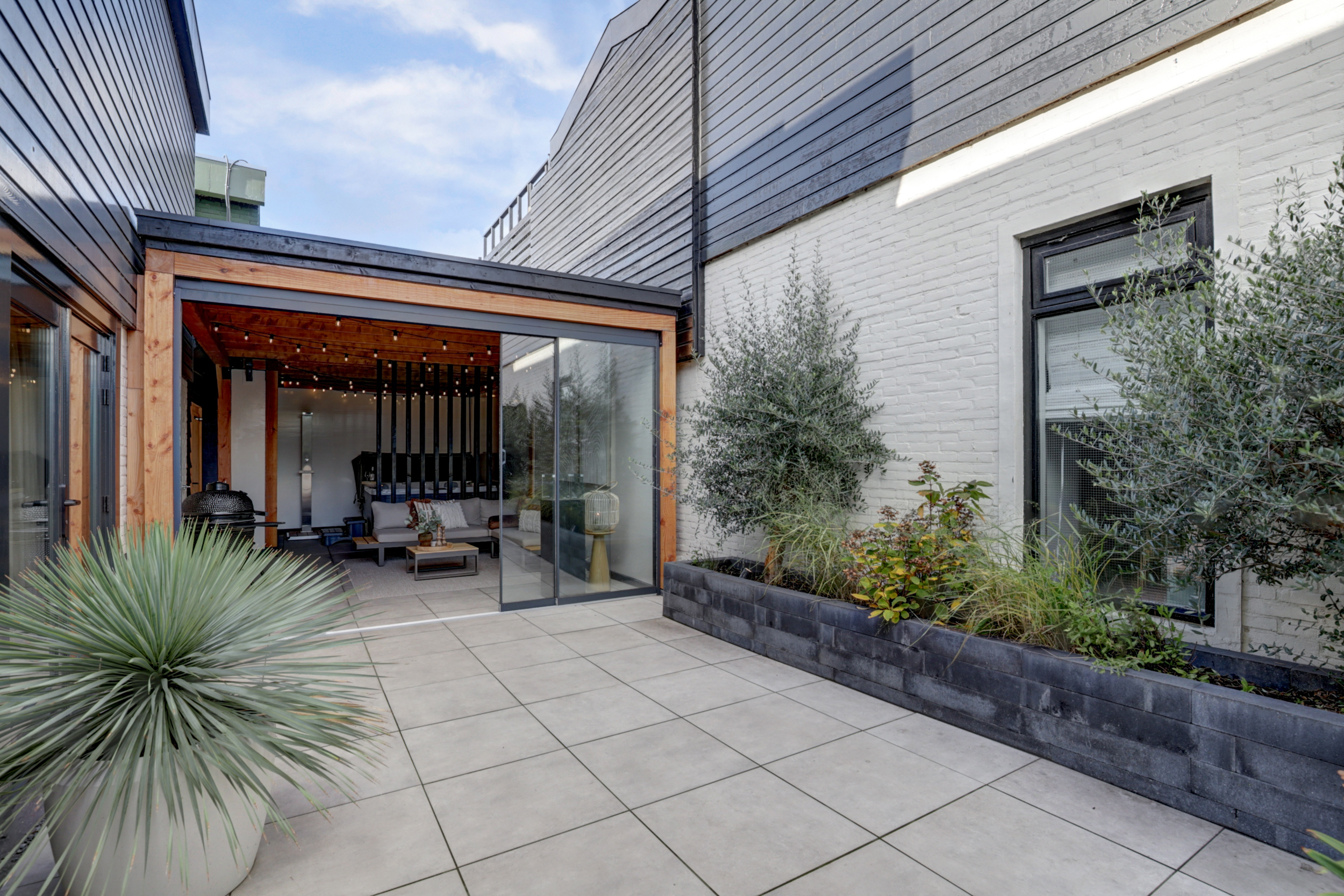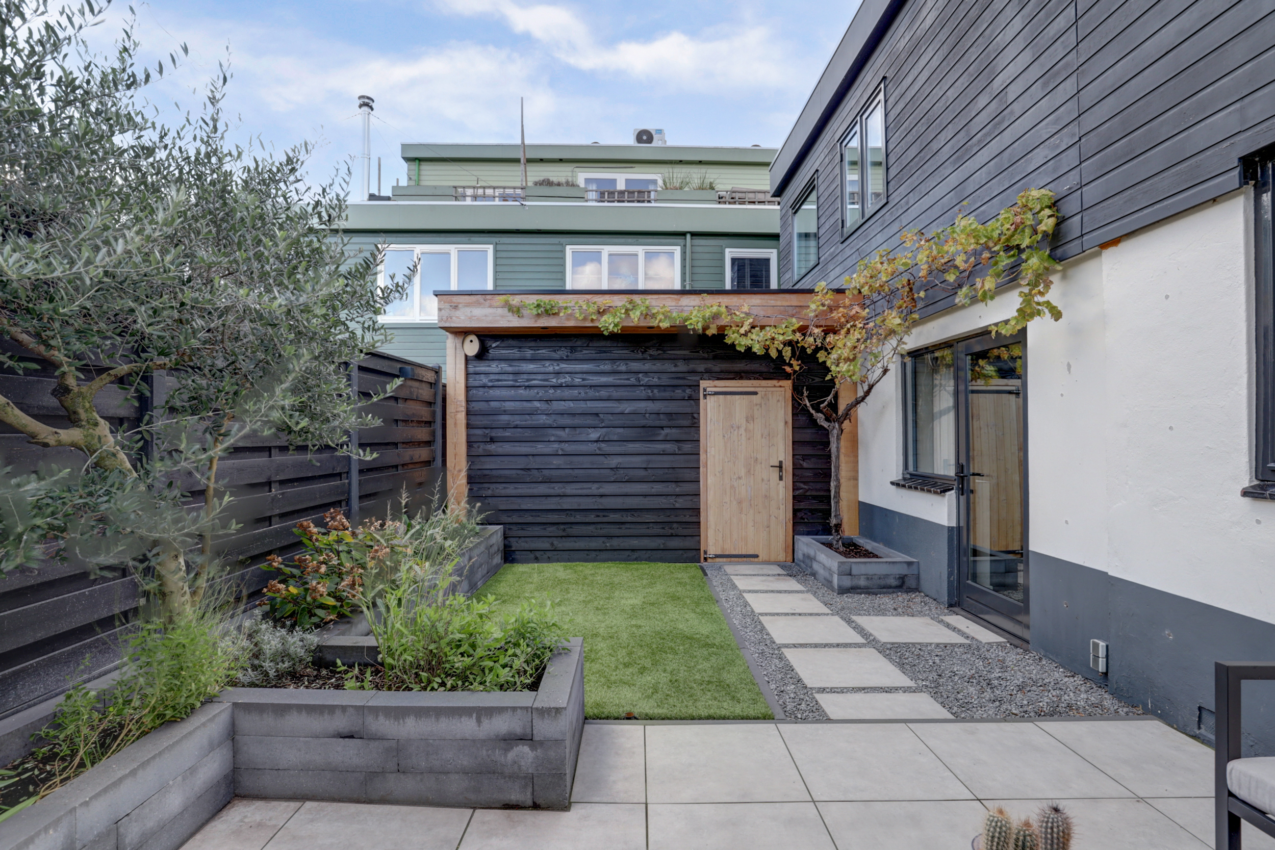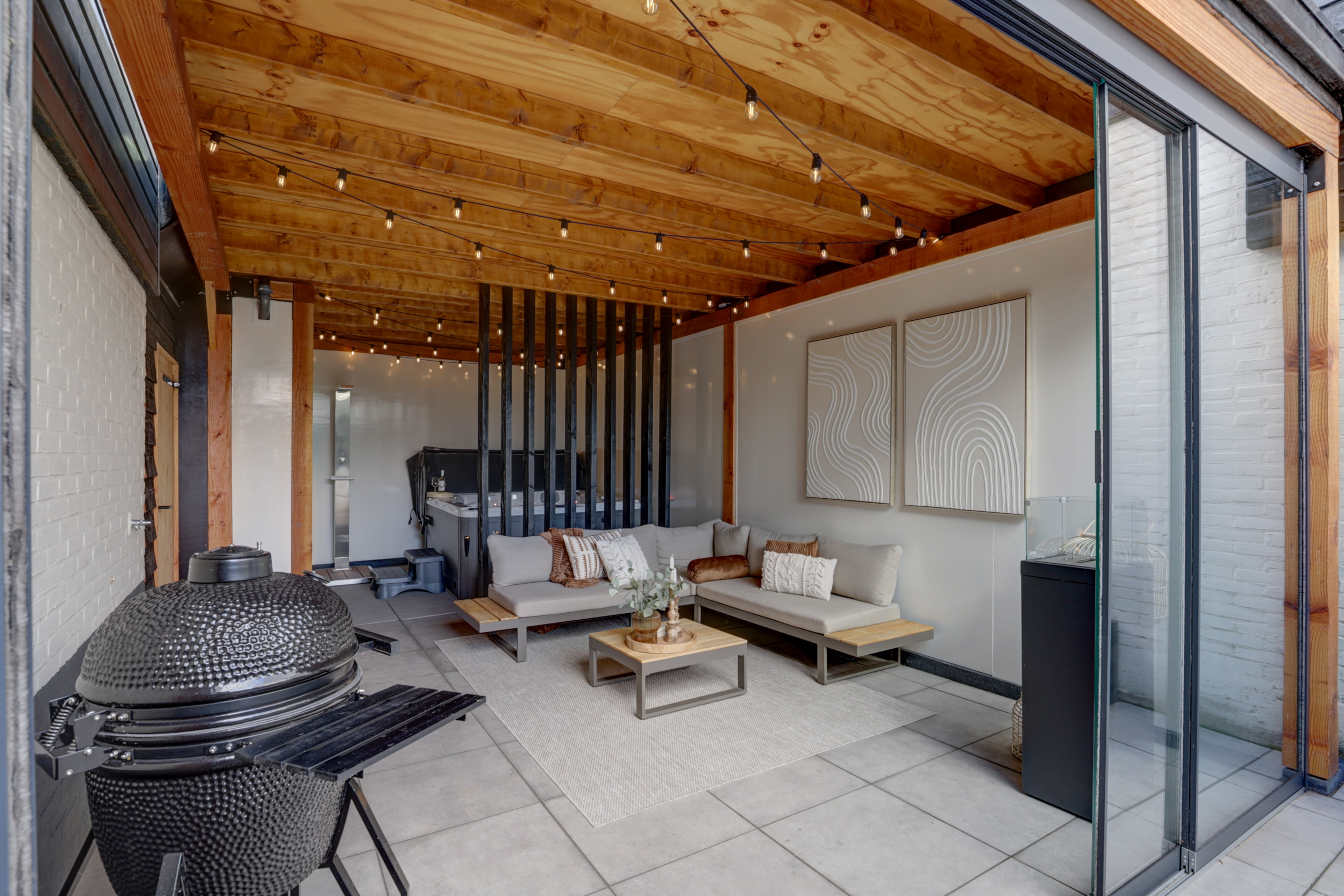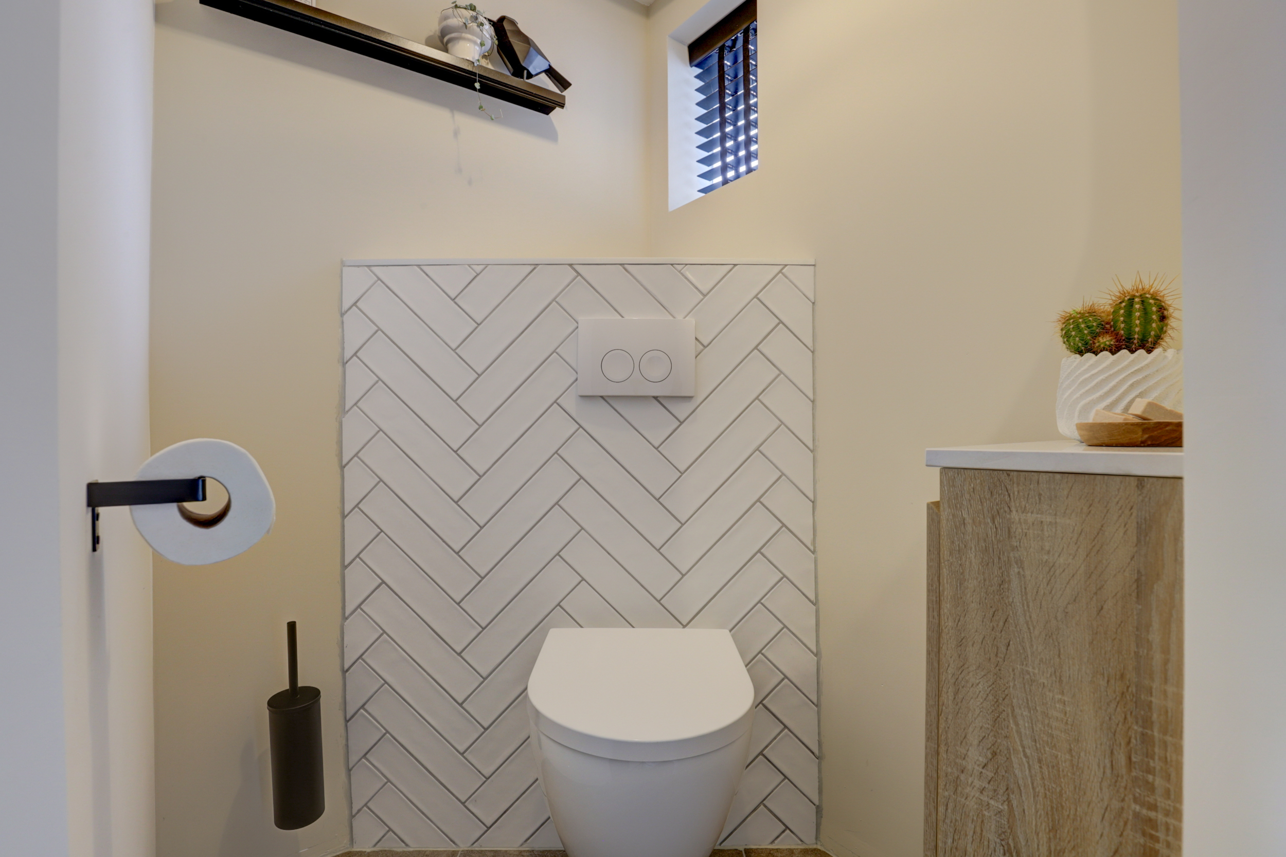 De keuken aan de andere achterzijde van de woning, is een echte blikvanger! Modern vormgegeven in een U-opstelling met houtstructuur fronten en een wit marmeren werkblad. Dankzij het grote daklicht valt het daglicht hier prachtig binnen. De keuken is voorzien van een inductiekookplaat, inbouwapparatuur op ooghoogte en veel kastruimte. Aan de keuken grenst een gezellig eetgedeelte waar u comfortabel kunt tafelen met uitzicht op de tuin. Hier kookt u niet alleen met gemak, maar geniet u ook van de stijlvolle afwerking. Vanuit de keuken bereikt u via beide kanten direct het terras in de achtertuin!