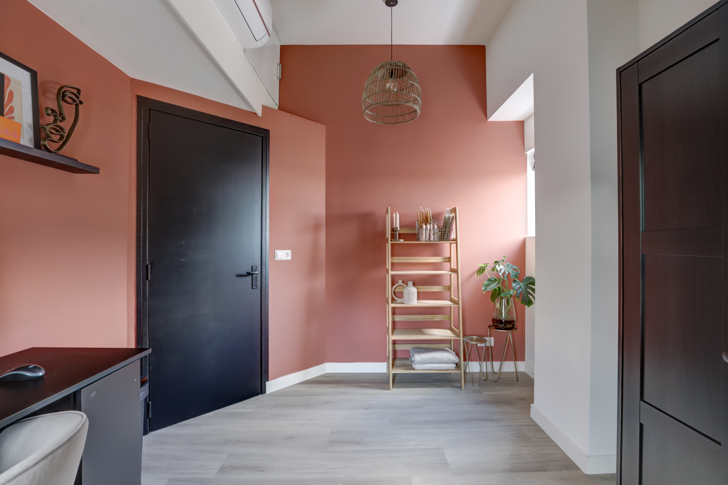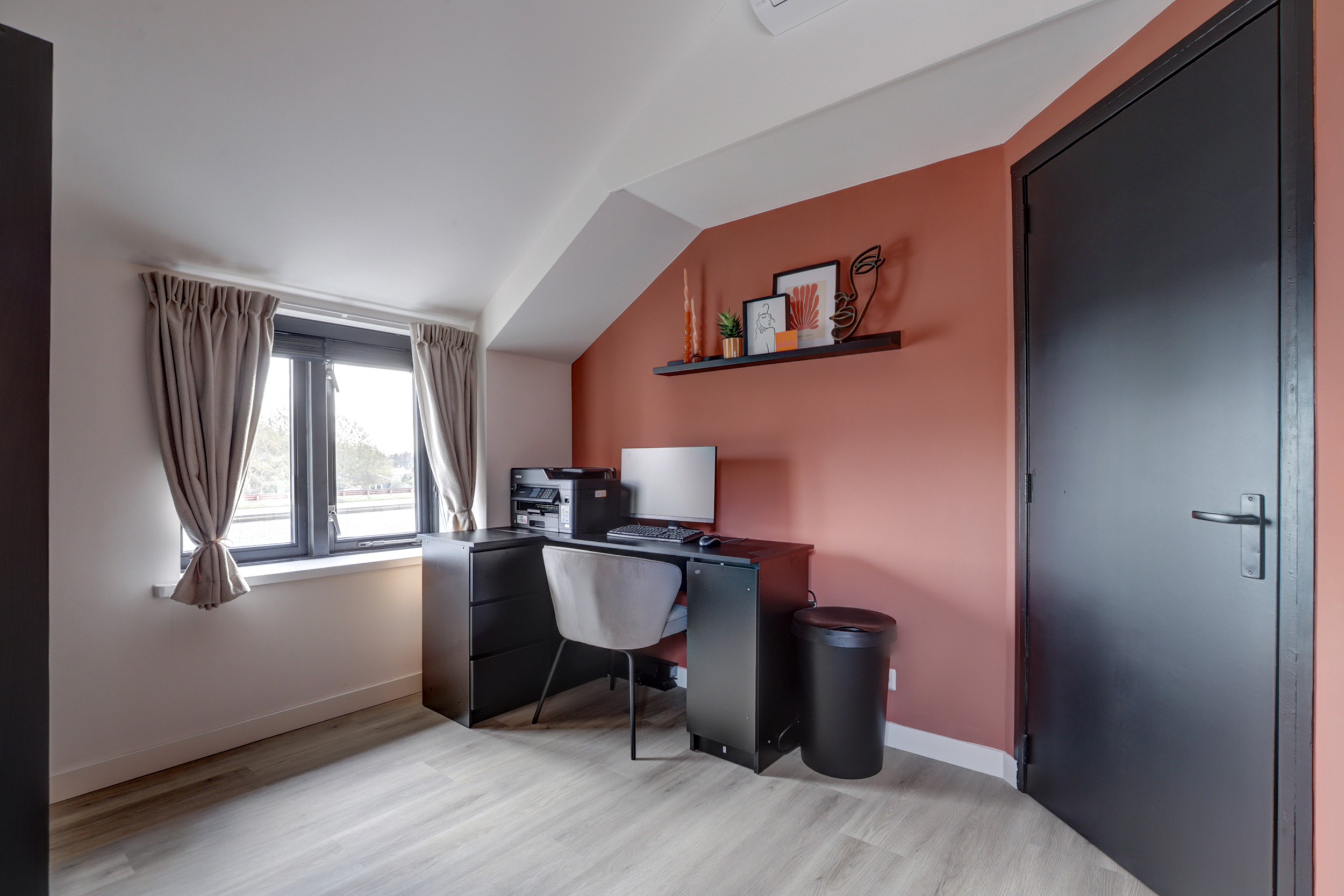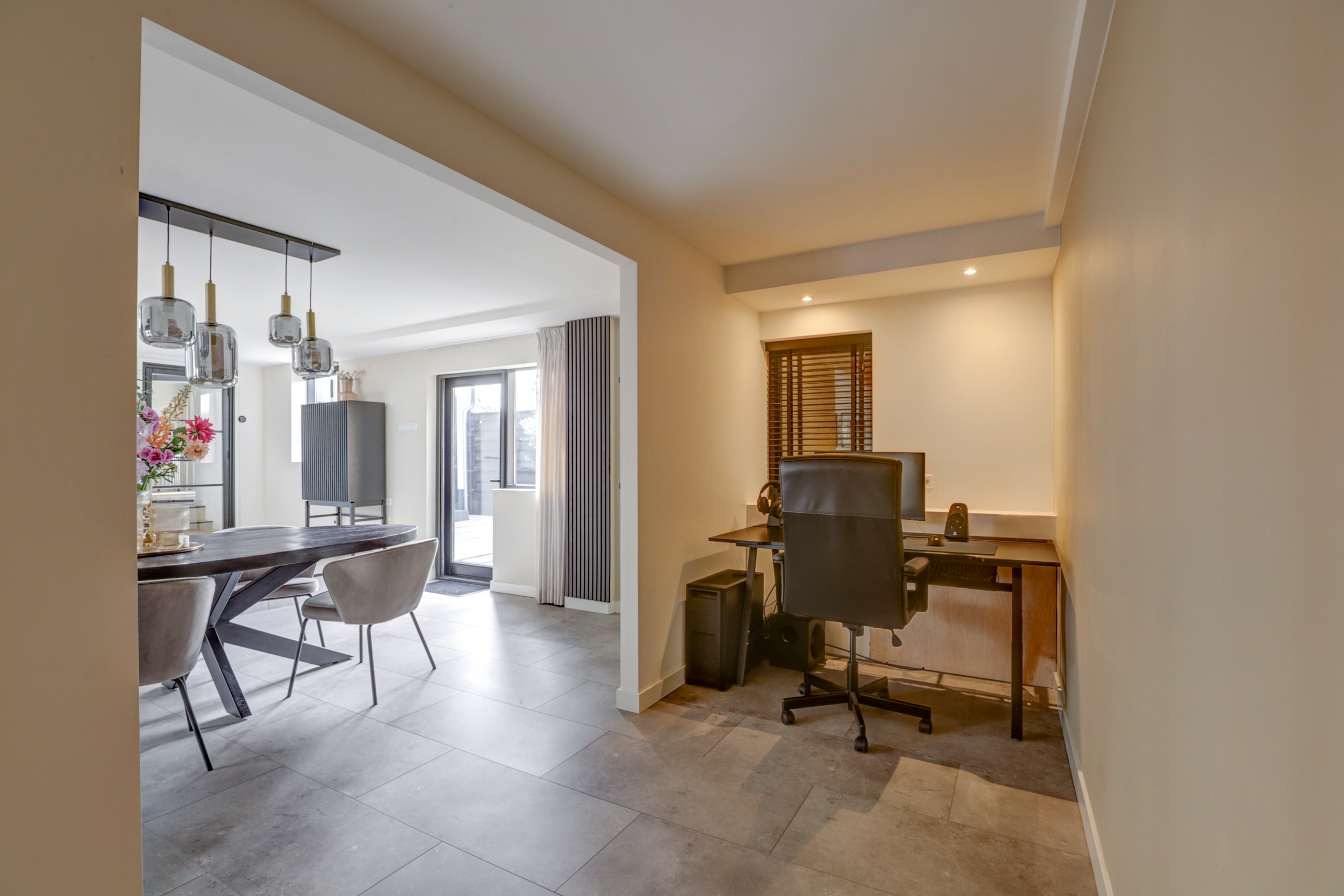 Aangrenzend aan de eethoek bevindt zich een werkruimte, ideaal voor thuiswerken. Deze kamer heeft een rustige uitstraling. Via de tuin is bovendien de berging met CV-installatie bereikbaar, evenals een multifunctionele ruimte die zich uitstekend leent als thuiskantoor, speelkamer of gastenverblijf.