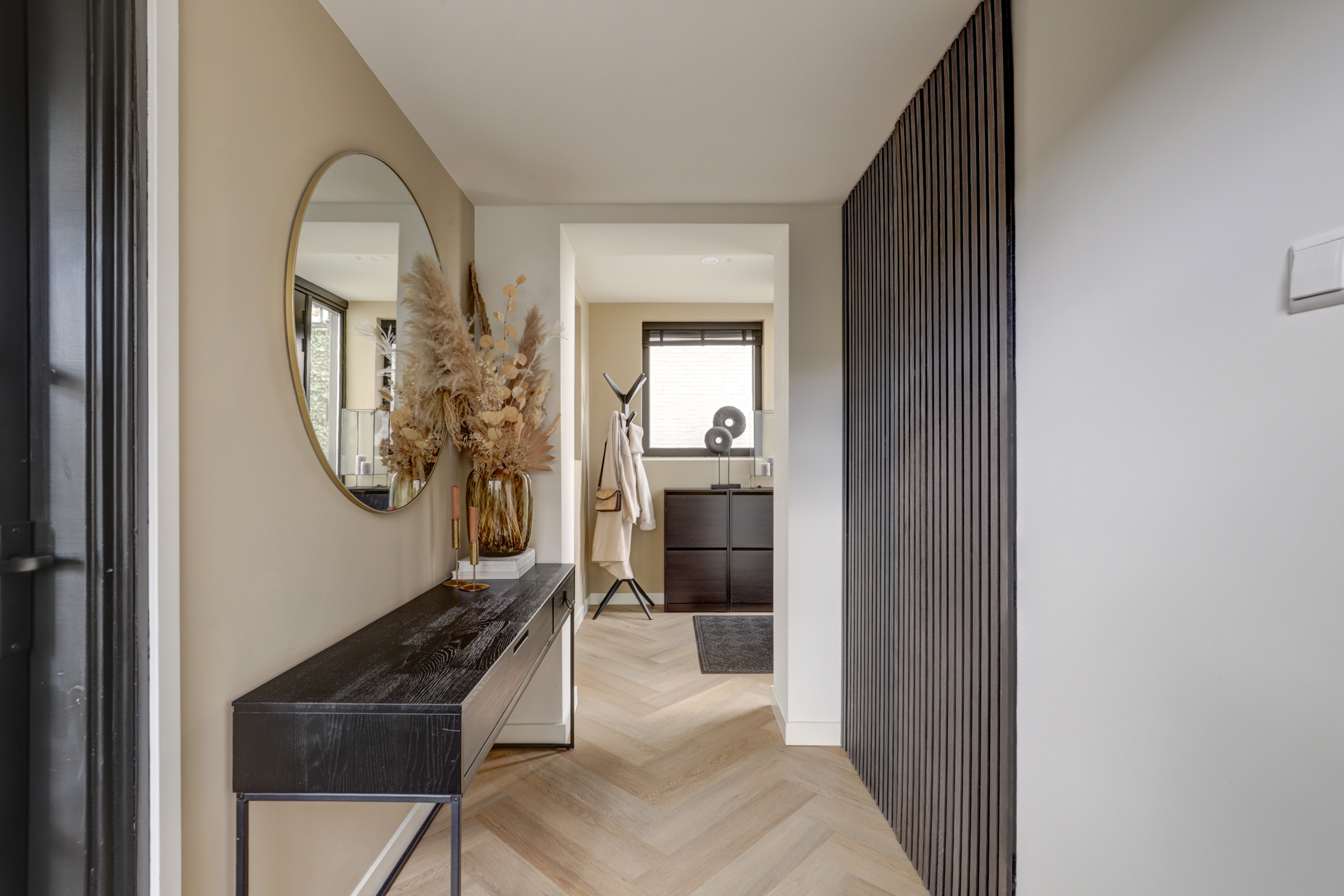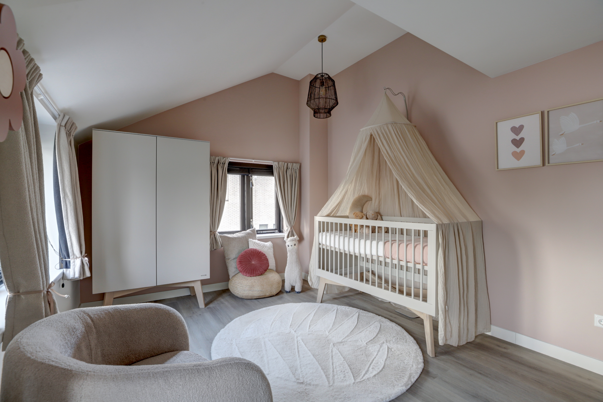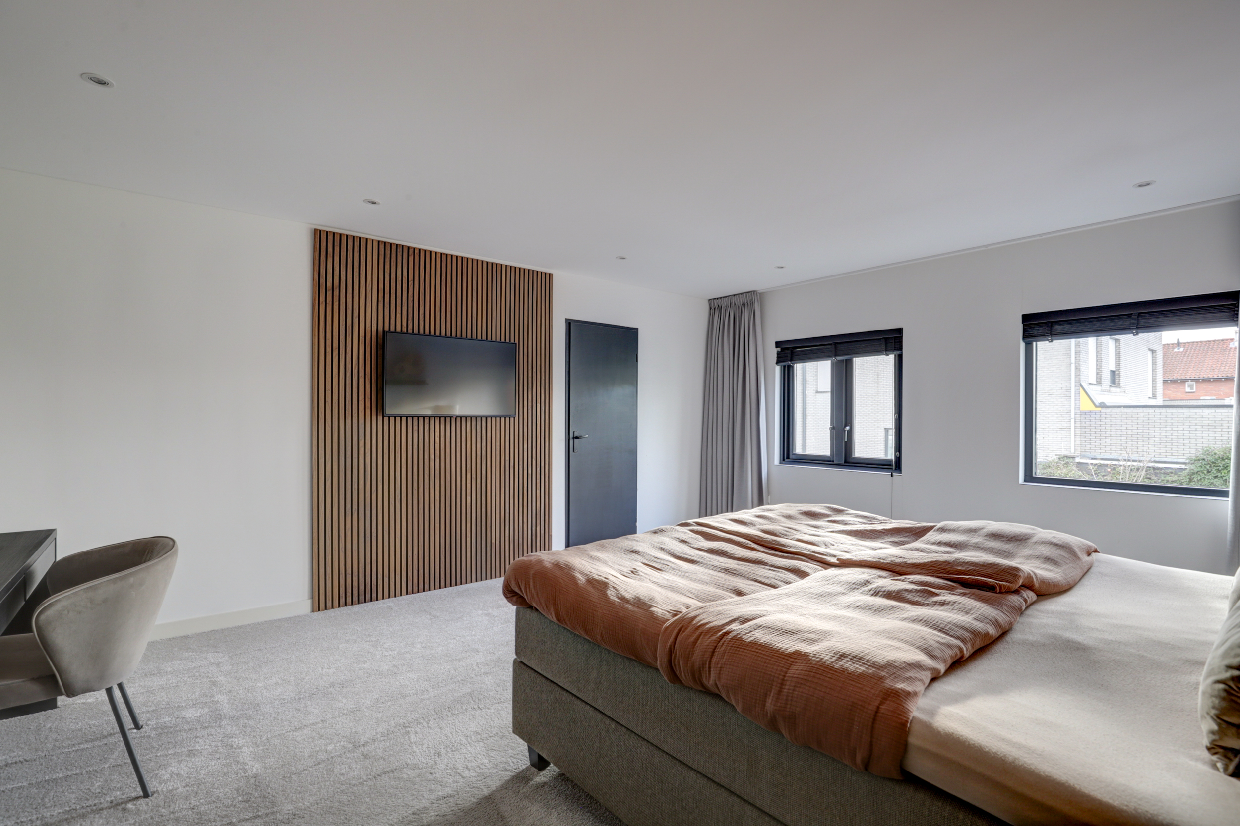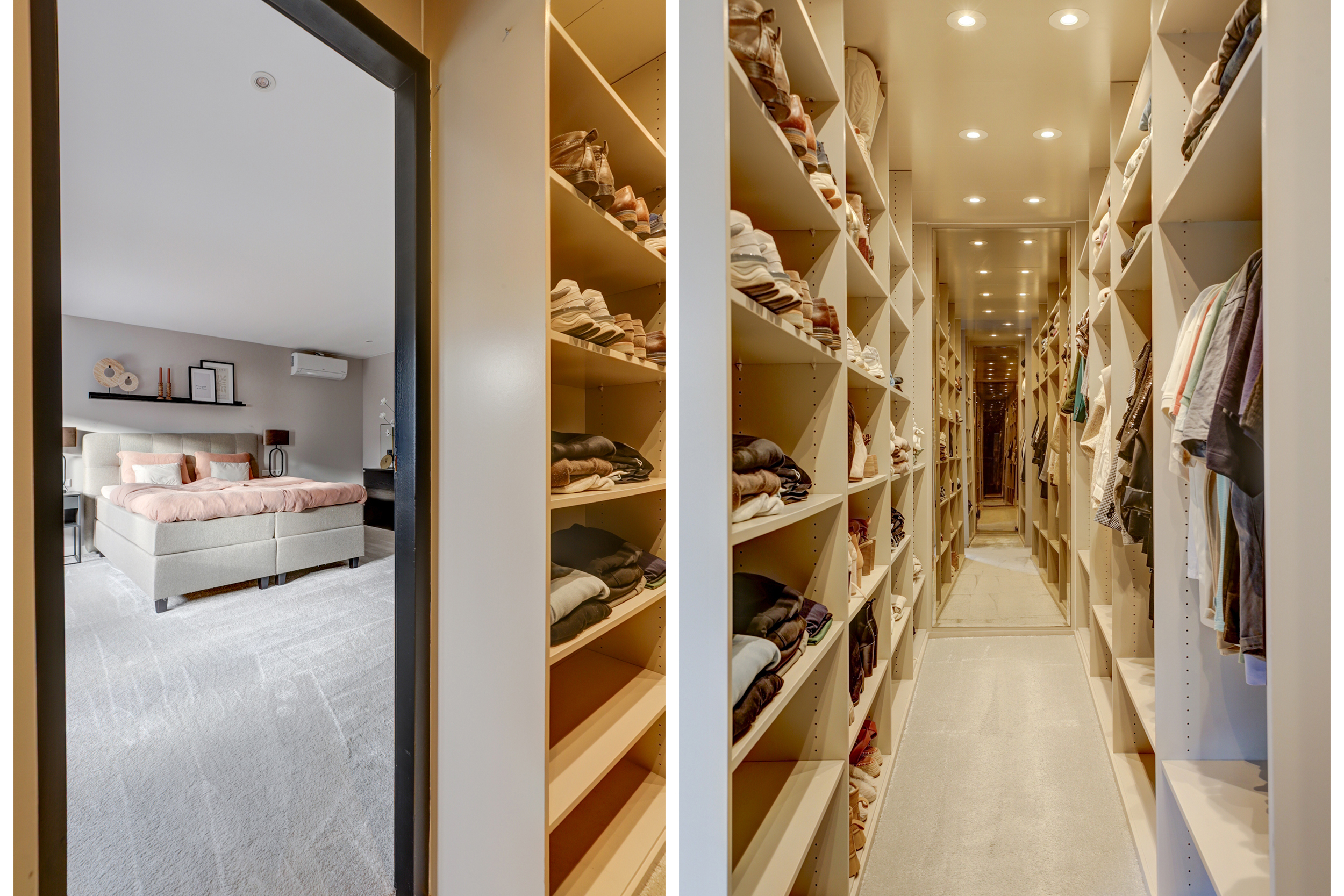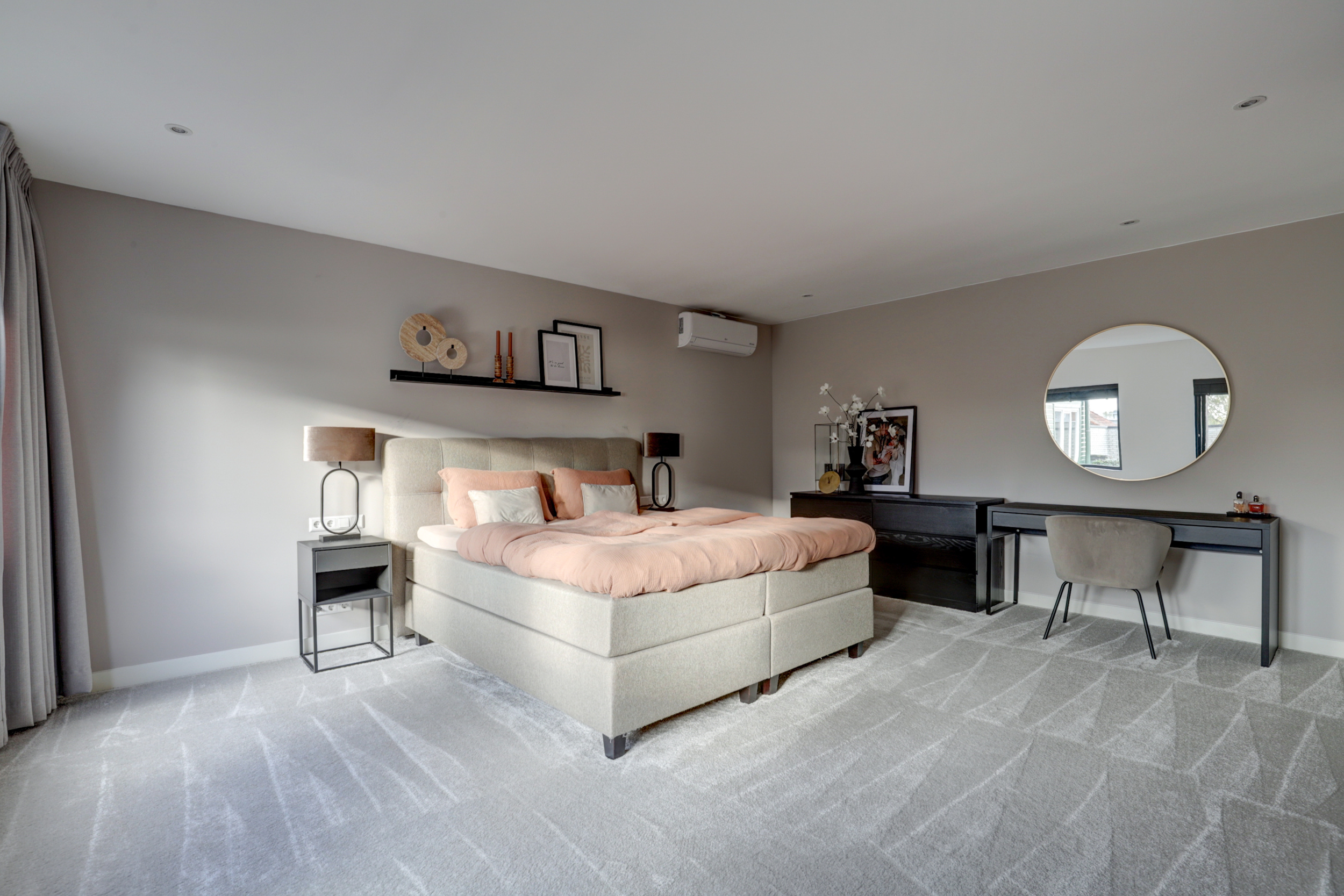 De eerste verdieping is ruim van opzet en biedt vier slaapkamers. De master bedroom aan de achterzijde is royaal en sfeervol ingericht met een warme zandkleurige wand, strak tapijt in zachte grijstint en een airconditioningunit voor optimaal comfort. Aangrenzend bevindt zich een volwaardige inloopkast met maatwerk kasten en inbouwverlichting, een ware luxe voor liefhebbers van overzicht en stijl!