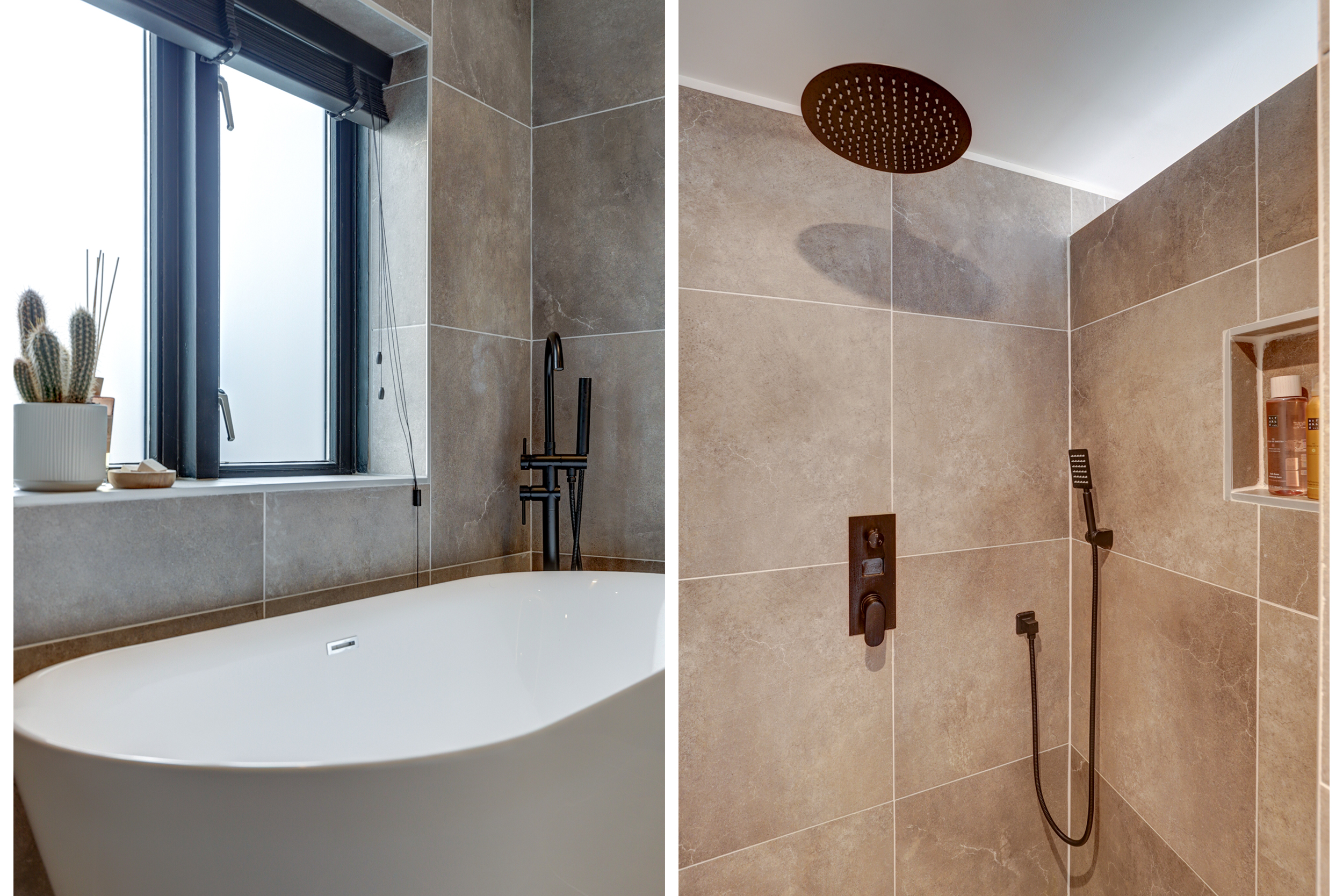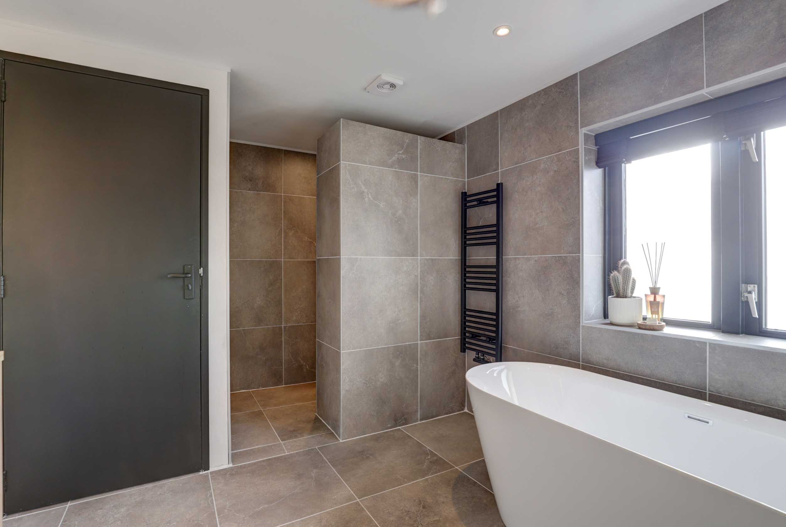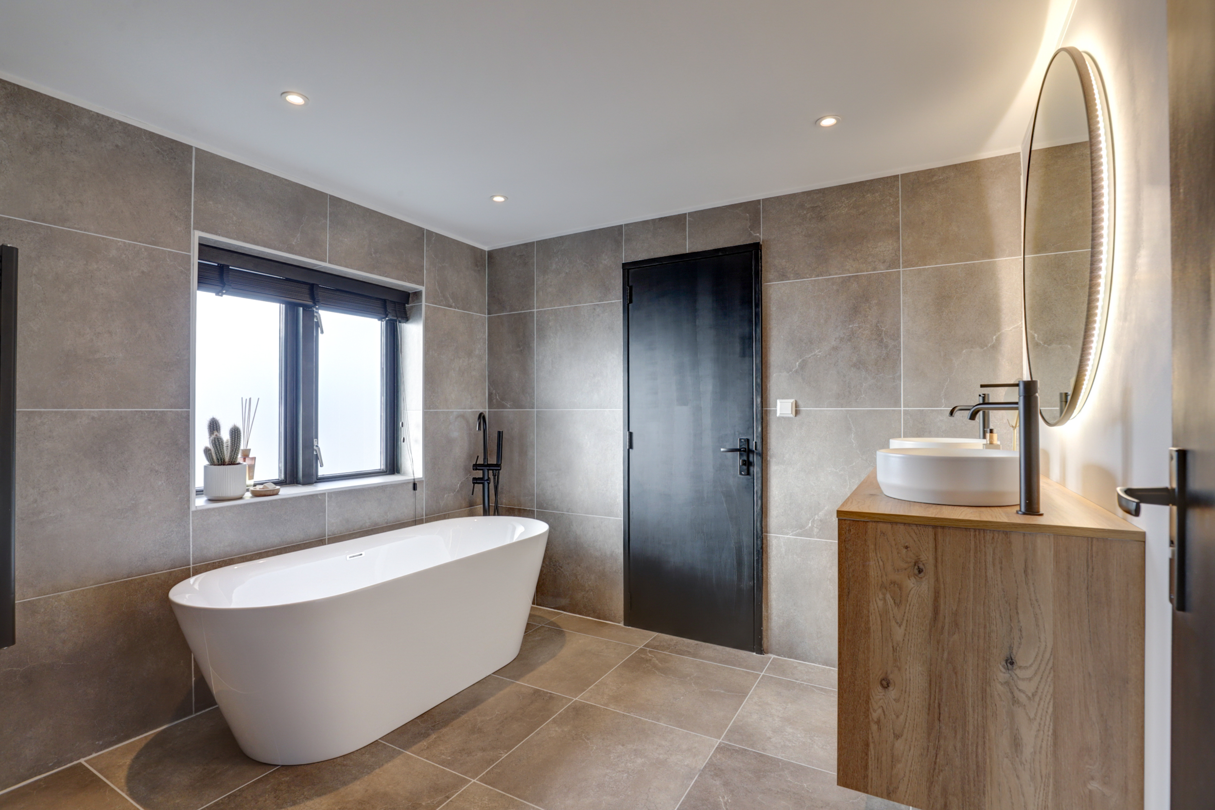 De badkamer is modern en elegant, uitgevoerd in grote grijsbruine tegels met zwarte accenten. De ruimte is bereikbaar zowel vanuit de master bedroom als vanuit de hal. Ze is voorzien van een vrijstaand ligbad, inloopdouche, zwevend houten wastafelmeubel met ronde spiegel en verlichting, en een raam met matglas voor daglicht en privacy. De combinatie van hout, zwart staal en natuursteenlook geeft de ruimte een spa-achtige uitstraling.