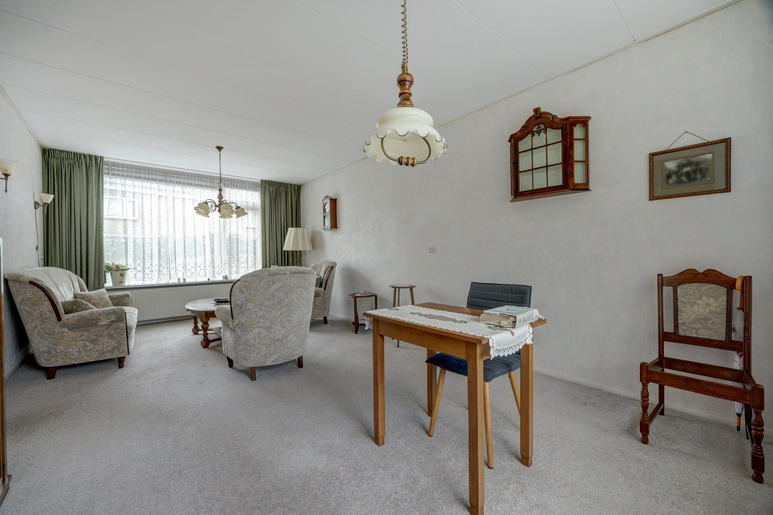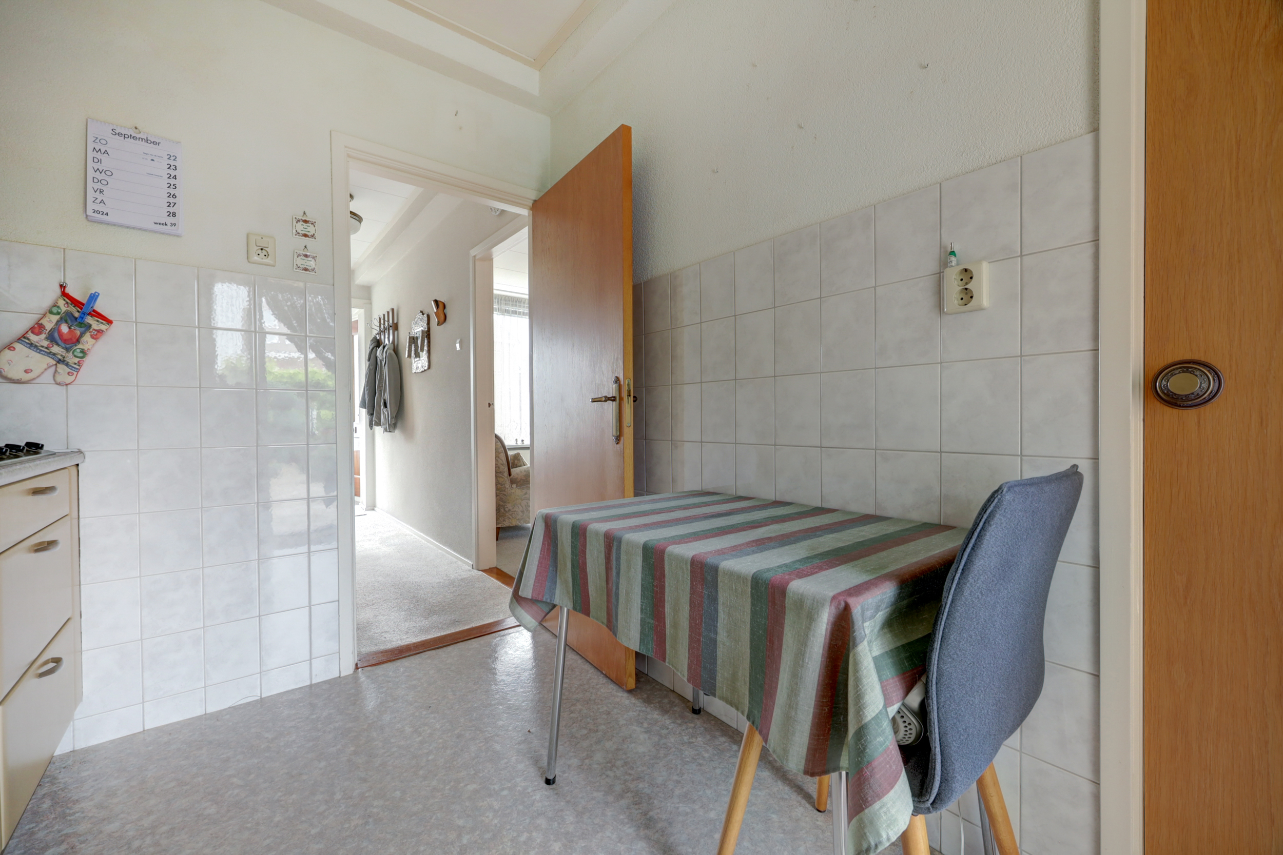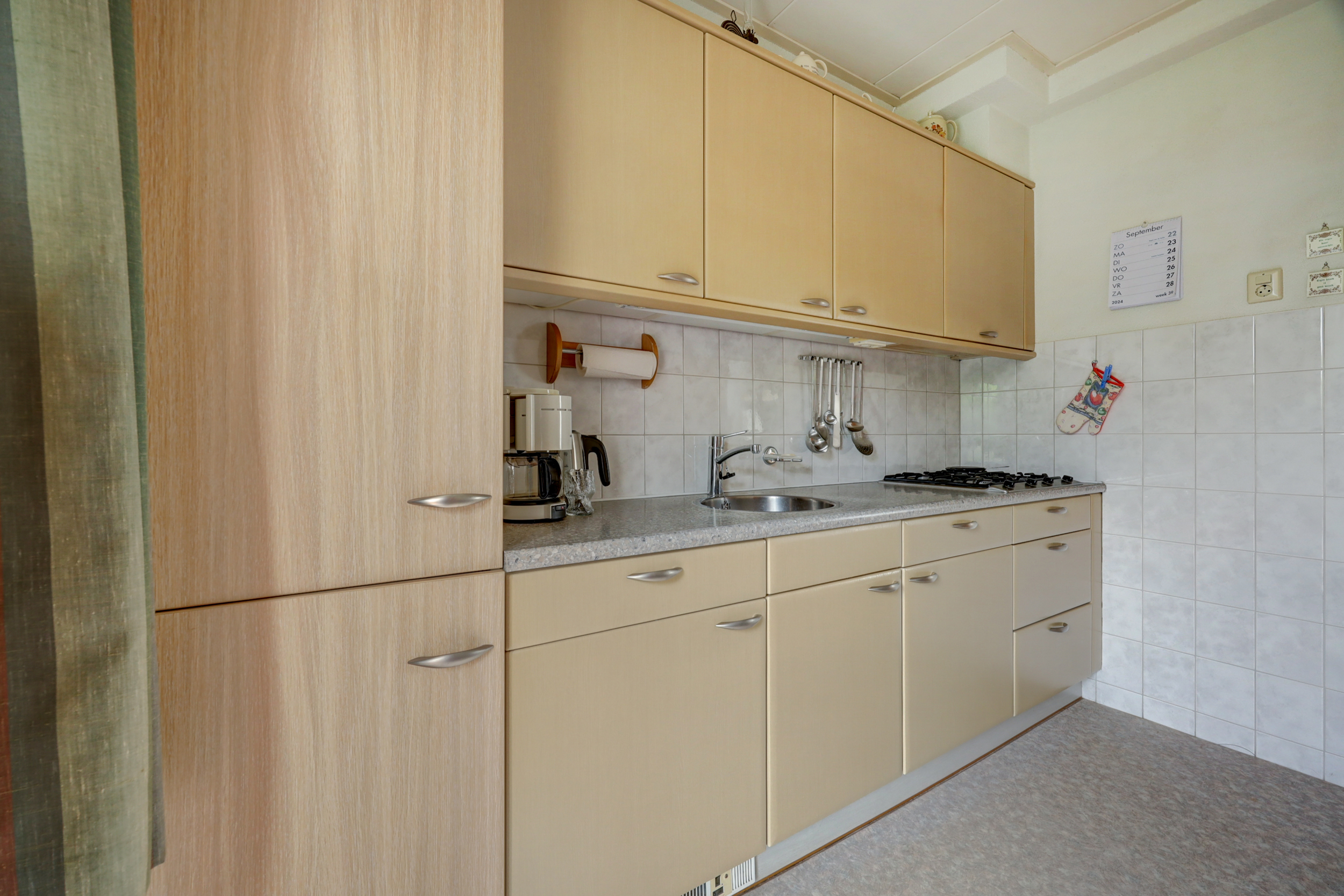 De doorzonwoonkamer is heerlijk licht dankzij de grote ramen aan de voor- en achterzijde. Aan de voorzijde is een gezellig zitgedeelte gecreëerd waar u comfortabel kunt ontspannen met uitzicht op de rustige straat. De wanden zijn in lichte tinten afgewerkt en de vloer is voorzien van tapijt. Aan de achterzijde is voldoende ruimte voor een eettafel met zicht op de tuin. De keuken is praktisch ingedeeld met een lang, recht keukenblok met een groot werkblad en witte wandtegels. Er zijn een 4-pits gaskookplaat, een koelkast en een vriezer aanwezig. Een tuindeur geeft direct toegang tot de achtertuin. In de keuken bevindt zich tevens een vaste kast, altijd handig voor voorraad en extra bergruimte.