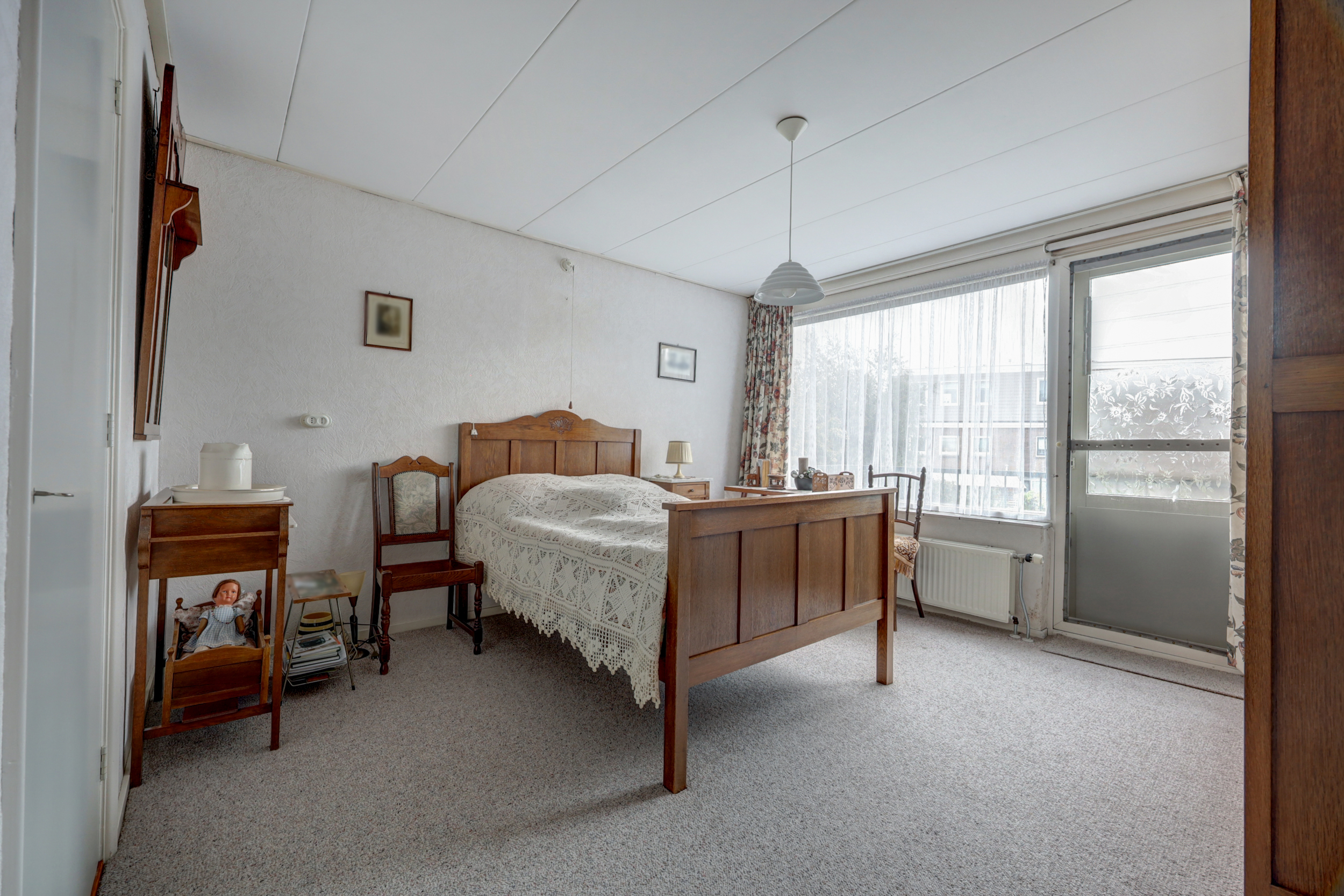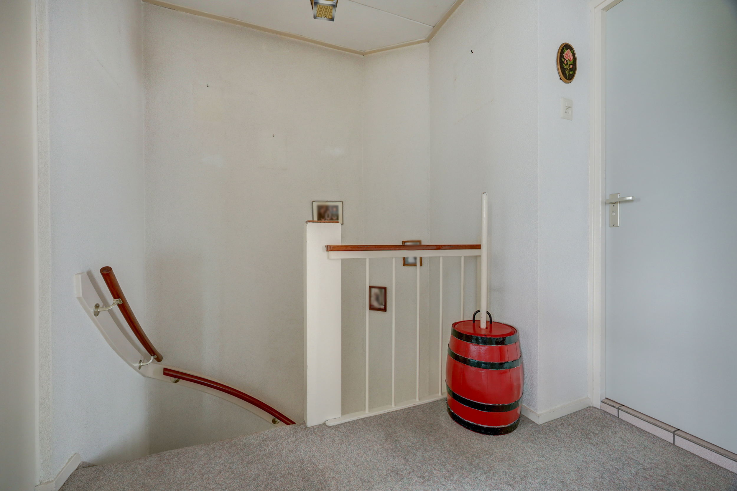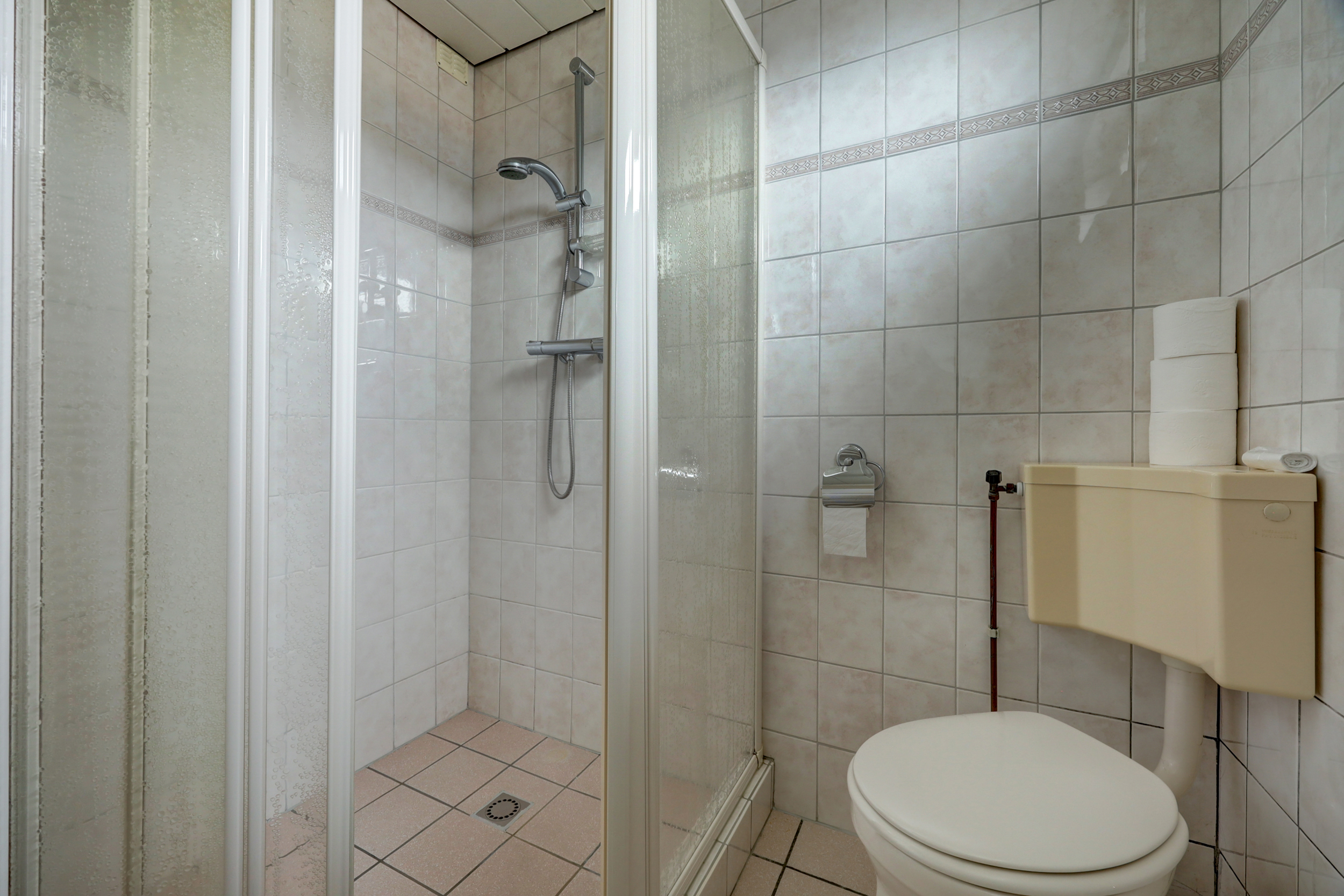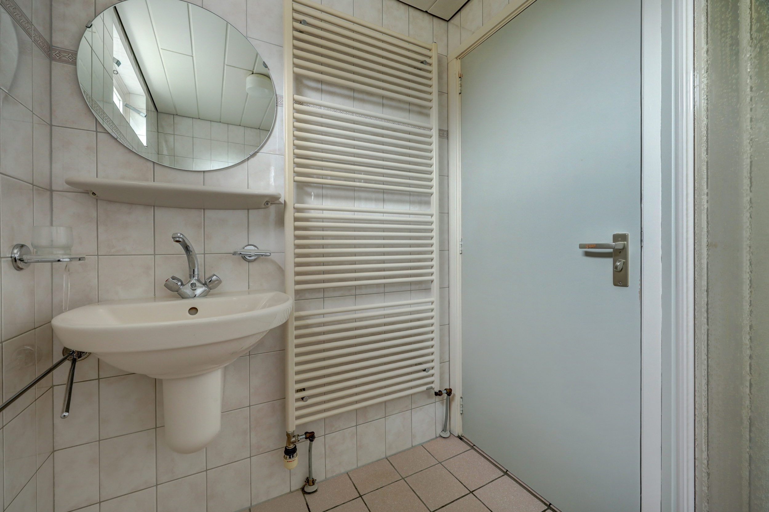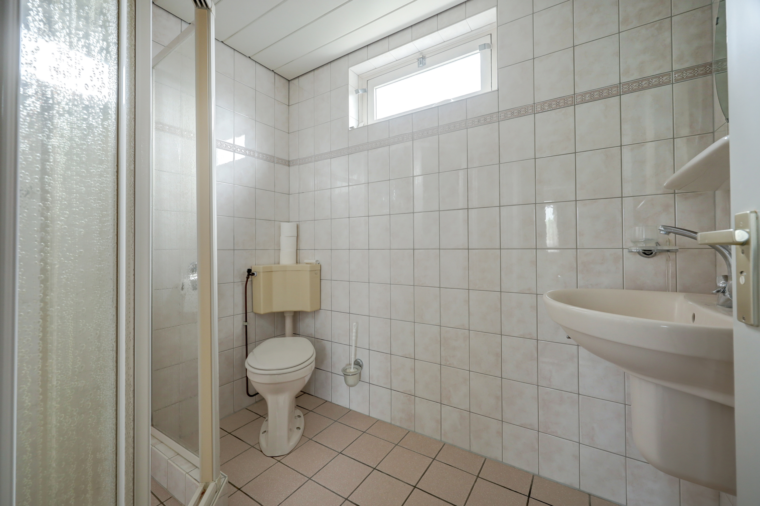 Op de eerste verdieping leidt de overloop u langs alle vertrekken. Aan de achterzijde bevindt zich de ruime hoofdslaapkamer met een vaste kast, een groot raam en een deur naar het balkon. Aan de voorzijde ligt de tweede slaapkamer, prettig van formaat en eveneens voorzien van een vaste kast, ideaal voor kleding of extra bergruimte. Daarnaast treft u een ruime, praktische was- en bergruimte met aansluitingen voor wasmachine en droger, en de cv-combiketel (Remeha, 2015) is hier keurig opgesteld. De badkamer is volledig betegeld in een lichte tint en beschikt over een douchecabine, wastafel en toilet. Een hooggeplaatst raam zorgt voor prettig daglicht en natuurlijke ventilatie.